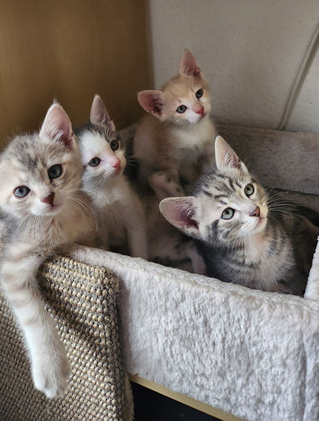 Merlin und Milan sind die zwei Jungs (rot und schwarz im Körbchen) Luzi und Lotta die zwei Mädels mit dem weißen Näschen, das bunte Mädchen ist Kira und das graue Mädel ist Feli.